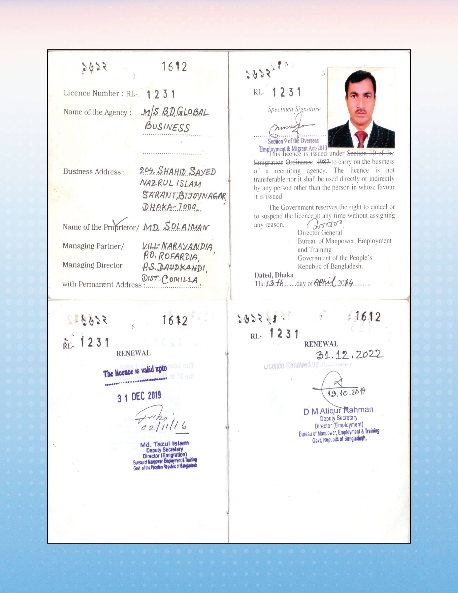 M/S Bdglobal business is one of the leading Manpower Agencies in Bangladesh with government approved Manpower recruiting License No. RL-1231, registered under the Ministry of Expatriates’ Welfare & Overseas Employment. M/S Bdglobal business is a member of Bangladesh Association of International Recruiting Agencies (BAIRA).